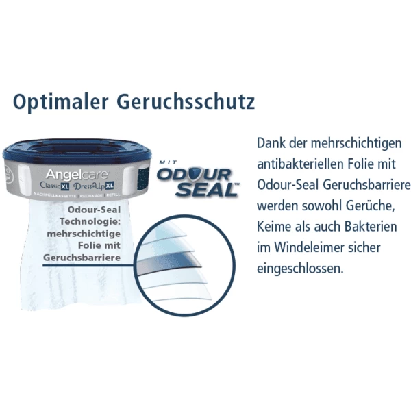 De geïntegreerde achthoekige navulcassette bevat een luchtondoorlatende 7-laags, antibacterieel gecoate foliebuis met geurbarrière, wat de enige manier is om ervoor te zorgen dat de Angel care ®Dress-Up XL, in tegenstelling tot de luieremmertjes van conventionele vuilniszakken, ontsnappen noch geuren, noch ziektekiemen en bacteriën naar buiten.