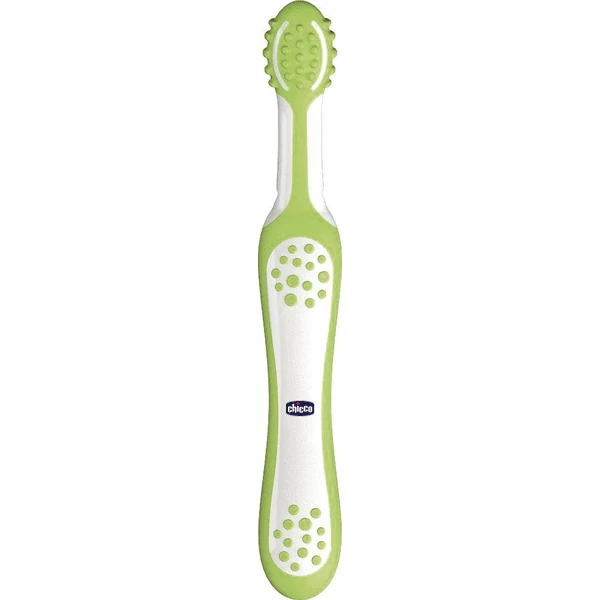 De kleine afgeronde kop van de tandenborstel past perfect in de mond van uw baby. De extra zachte, taps toelopende borstelharen reinigen zachtjes tandvlees en tanden. De borstelhals is zijwaarts gebogen om moeilijk bereikbare plaatsen te reinigen. De handgreep van de borstel is breed, zacht en antislip, zodat u hem gemakkelijk kunt vasthouden. Praktische, hygiënische borstelkap wordt meegeleverd. Er zit ook een tongschraper aan de kop van de borstel om uw tong te reinigen.