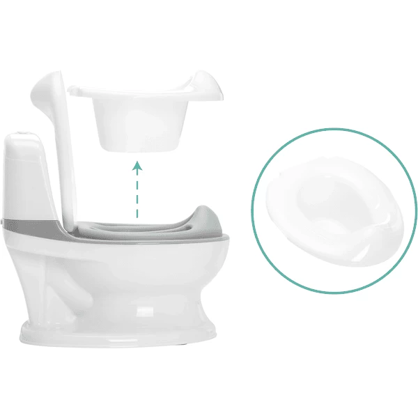 Tijdens de ontwikkeling lag de nadruk vooral op het leereffect en het spelenderwijs trainen. Het realistische uiterlijk en de bijbehorende functies maken de overgang van luier naar potje veel gemakkelijker en interessanter voor het kind, omdat het de basisvorm en het uiterlijk al kent van het toilet van de ouders. Het nieuwe minitoilet biedt uw kind de mogelijkheid om na het toiletbezoek het deksel te sluiten en op de doorspoelknop te drukken, die dan een realistisch doorspoelgeluid maakt en oplicht. Om de meest realistische toiletervaring compleet te maken, kan een nat doekje uit de achterkant van de stortbak worden gehaald.