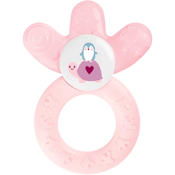 - De gebogen vorm en oppervlaktestructuren bevorderen de motoriek en maken het voor de baby gemakkelijker om de bijtring vast te pakken en vast te houden.
