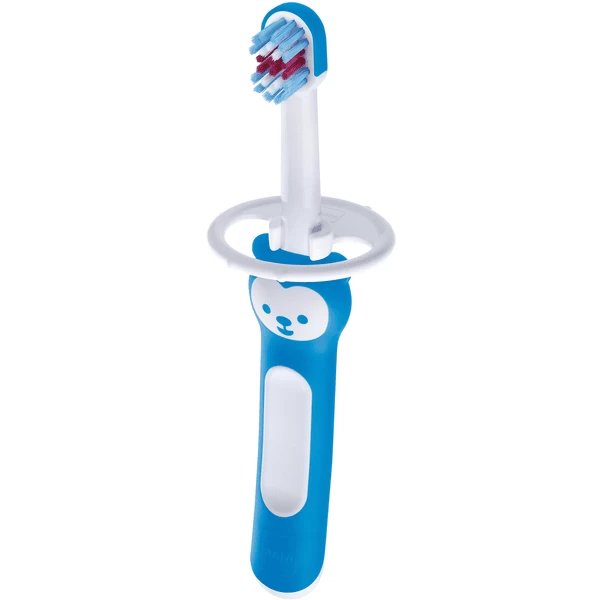 Eerste stap Training Brush: met de extra lange handgreep kunnen ouders en baby de tandenborstel samen vasthouden. Tweede stap First Brush: het kindje kan zelfstandig poetsen.