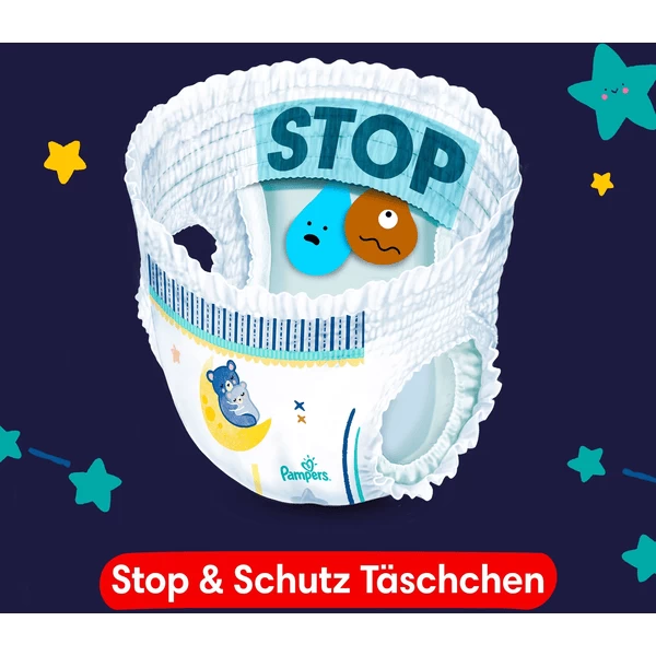 - Pampers Baby-Dry Night broekjes bieden tot 12 uur extra bescherming tegen lekkage voor een rustige nachtrust.