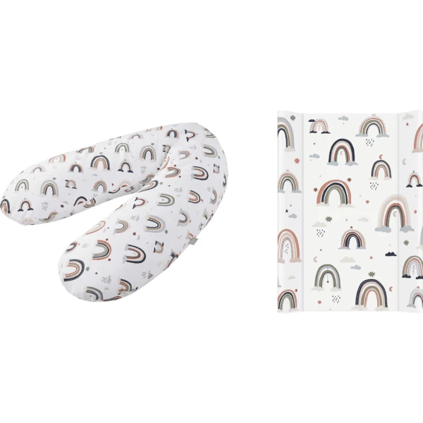 - Set van multifunctioneel verzorgingskussen (190 x 35 cm) en wig verschoonkussen (70 x 50 cm).