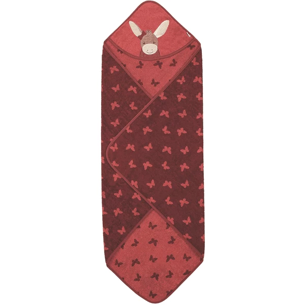 Badcape van zachte badstof, met opgestikt borduurmotief “Emmily” ezel. De knuffelgarantie volgens de B aden .