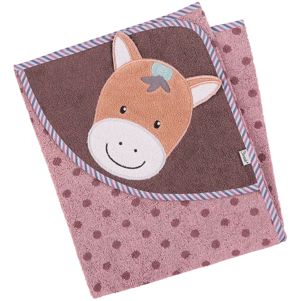 De pluizige badhanddoek met capuchon van badstof met uitgebreide applicatie pony “Pauline” beschermt de natte kop tegen tocht! voor de knuffelgarantie volgens de B aden .