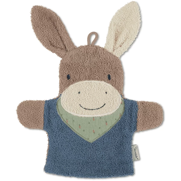 2 in 1: washandje en handpop-ezel “Emmilius” van badstof maken het wassen heel leuk.